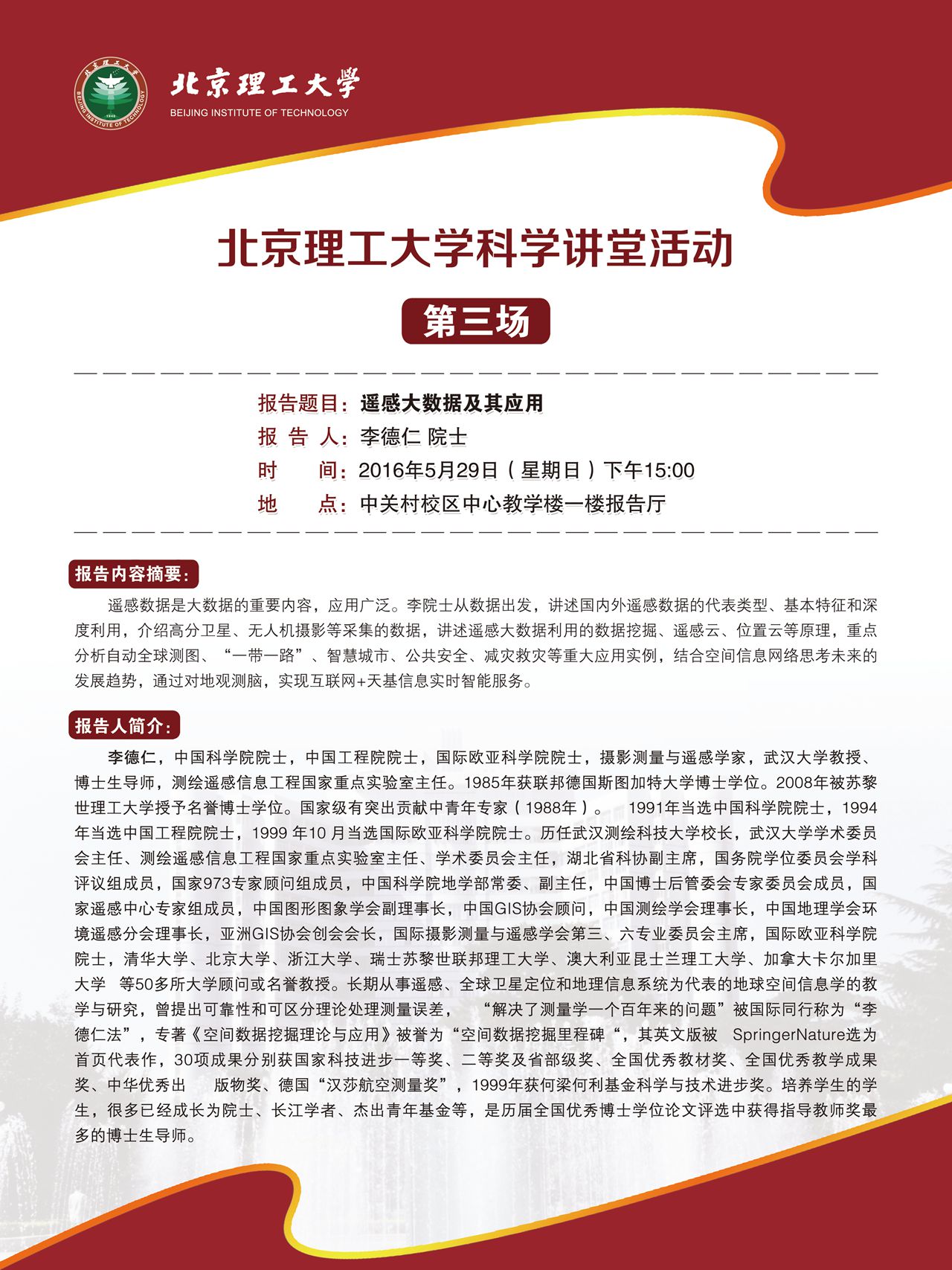 北京理工大学科学讲堂活动通知——李德仁院士遥感大数据及其应用学术报告