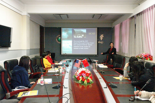 2008年11月6日,加州大学圣地亚哥分校的Roxanne女士和Etran Chane女士访问我校,与我校教务处和国际交流合作处的老师讨论了我校本科生访学项目的相关事宜,并给学生介绍了到加州大学圣地亚哥分校选课、听课和参加实践活动应注意的问题,回答了同学们的提问。