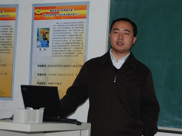 12月5日,继人格熏陶心理健康讲座之后,2009年研究生党员骨干培训班迎来了能力讲座,本次讲座邀请的是酷我科技公司的创始人和首席执行官雷鸣先生。雷鸣先生曾经是百度公司的创始团队成员和首席构架师,在北京大学就读期间,是中国最早的搜索引擎国家重点研究项目“天网”的核心成员。