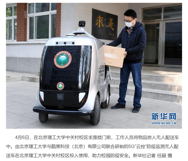 4月6日,在北京理工大学中关村校区求是楼门前,工作人员将物品放入无人配送车中。由北京理工大学与酷黑科技(北京)有限公司联合研制的5G“云控”防疫监测无人配送车在北京理工大学中关村校区投入使用,助力校园防疫安全。