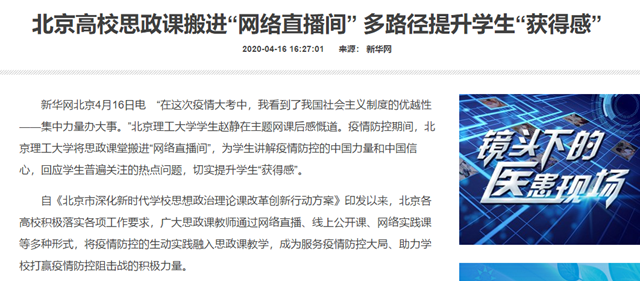 “在这次疫情大考中,我看到了我国社会主义制度的优越性——集中力量办大事。”北京理工大学学生赵静在主题网课后感慨道。疫情防控期间,北京理工大学将思政课堂搬进“网络直播间”,为学生讲解疫情防控的中国力量和中国信心,回应学生普遍关注的热点问题,切实提升学生“获得感”。