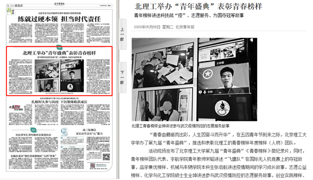 活动现场发布了北京理工大学第九届“青年盛典”《青春榜样》微纪录片,同时,青年榜样团队代表、宇航学院青年教师宋韬讲述“飞鹰队”在国际无人机竞赛上的夺冠故事,品学兼优榜样、机械与车辆学院本科生张启航讲述疫情期间的学习成长故事,志愿公益榜样、化学与化工学院硕士生全坤讲述参与武汉疫情防控的志愿服务故事,创业实践榜样、光电学院博士生邵龙讲述科技战“疫”、创新报国的担当故事。