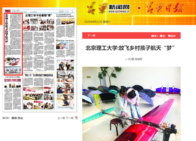 连日来,北京理工大学航模队46名实践团成员在方山县麻地会乡胡堡村开展暑期社会实践活动,为这里的孩子们带来了精彩的航模制作及飞行操作实践活动,把航模科普知识带到孩子们身边,点燃孩子们的小小创业梦想,也在他们的心里种下灿烂的航天梦和科技梦。