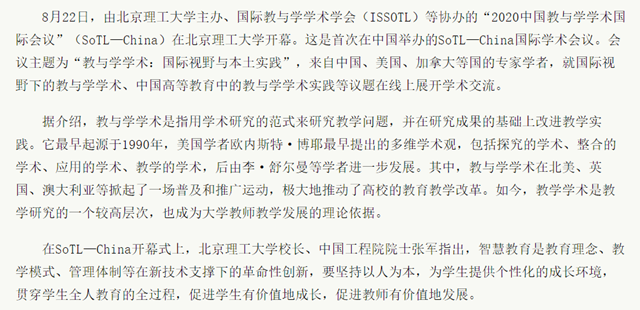 8月22日,由北京理工大学主办、国际教与学学术学会(ISSOTL)等协办的“2020中国教与学学术国际会议”(SoTL—China)在北京理工大学开幕。这是首次在中国举办的SoTL—China国际学术会议。会议主题为“教与学学术:国际视野与本土实践”,来自中国、美国、加拿大等国的专家学者,就国际视野下的教与学学术、中国高等教育中的教与学学术实践等议题在线上展开学术交流。