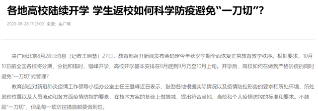 记者在采访中发现,大部分高校在秋季开学的防疫工作措施中,总体遵循“非必要不离校”的原则,但在具体细节中,根据各地防控要求、实际情况,做出与本地、本校相适应的具体要求。