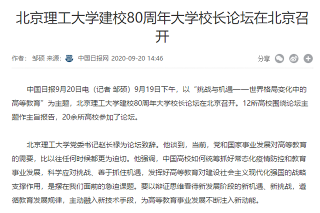 9月19日下午,以“挑战与机遇——世界格局变化中的高等教育”为主题,北京理工大学建校80周年大学校长论坛在北京召开。12所高校围绕论坛主题作主旨报告,20余所高校参加了论坛。