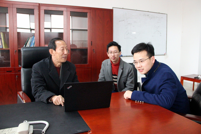 孙华飞(左)对学生曹越琦(中)、张世强(右)开展学术指导