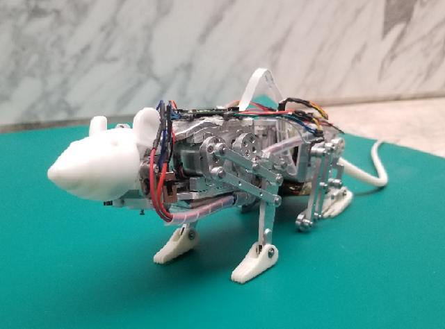相较于国内外研制的各类小型四足机器人,本项目机器鼠体型小、重量轻能够实现匍匐前进从而适合在变径的不规则狭窄空间侦察。且本项目机器鼠能在负重200g情况下平稳运动,相当于自身体重的60%,运输能力较强。两者结合使得本项目机器鼠能够在狭窄空间内负载运行,从而在抢险救灾中为救援人员传送小型检测设备或被困人员运输药物、水等必需品。本项目实现了仿生腿足结构的精巧设计和柔性腰部结构的优化设计,从而在运动能力上优于现有交互机器鼠,运动速度达到15cm/s,转弯半径小至6cm且能实现扭转,因而能够模拟更多真实鼠模态。